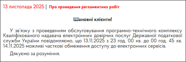 У зв’язку з проведенням обслуговування програмно-технічного комплексу Кваліфікованого надавача електронних довірчих послуг Державної податкової служби України повідомляємо, що 13.11.2025 з 23 год. 00 хв. до 00 год. 45 хв. 14.11.2025 можливі часткові обмеження доступу до електронних сервісів.