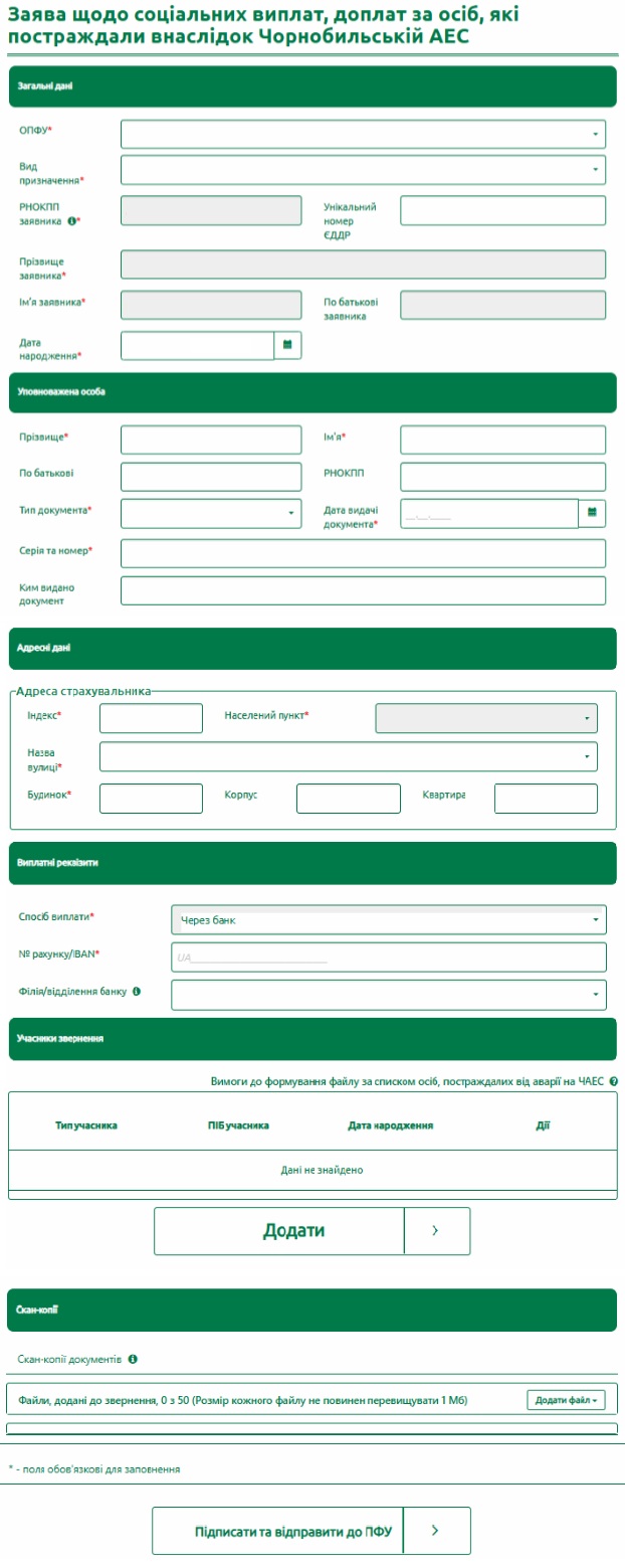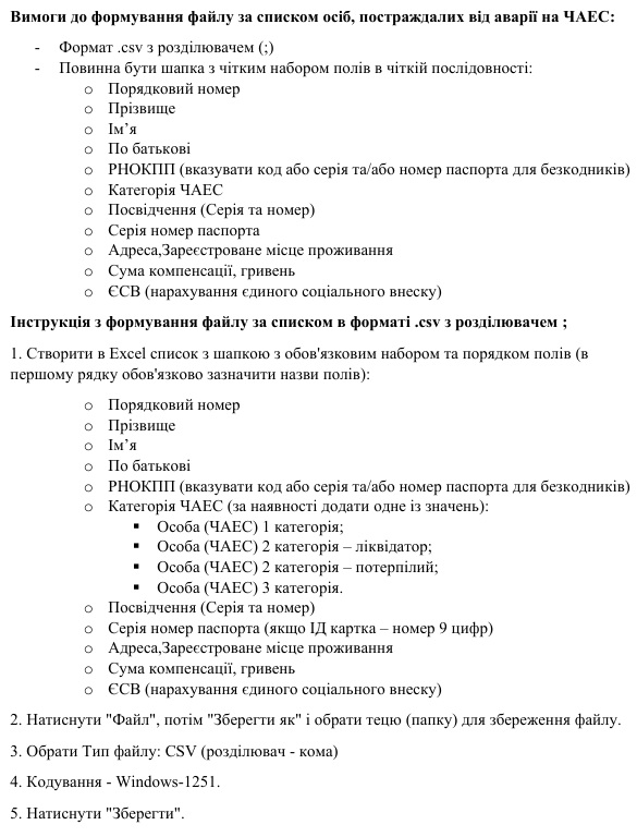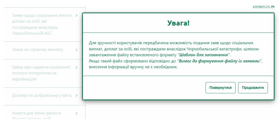 Для зручності користувачів передбачена можливість подання заяв щодо соціальних виплат, доплат за осіб, які постраждали внаслідок Чорнобильської катастрофи, шляхом завантаження файлу встановленого формату "Шаблон для заповнення" (див. додаток 1).