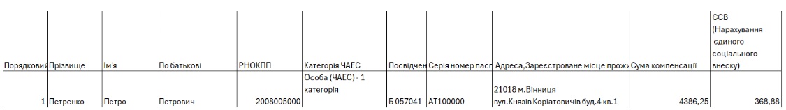 - реєстр отримувачів компенсацій — із зазначенням ПІБ, категорії, посвідчення, ІПН, суми;