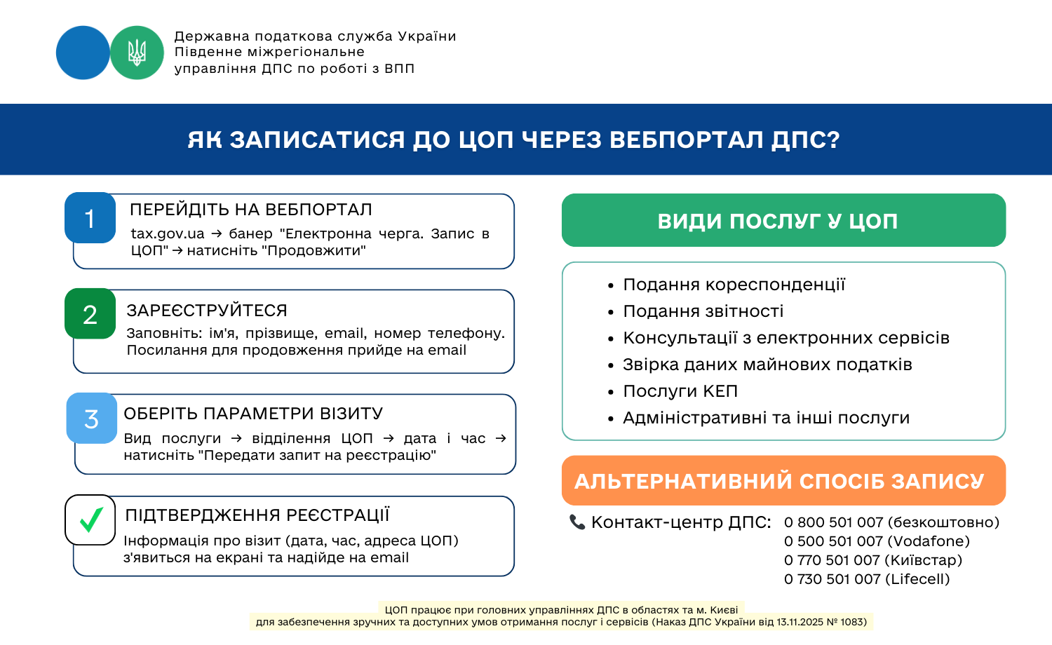 Південне міжрегіональне управління ДПС по роботі з великими платниками податків повідомляє, що згідно з абзацом другим розд. I Примірного положення центру обслуговування платників, затвердженого наказом Державної податкової служби України від 13.11.2025 №1083 «Про затвердження документів, які регламентують діяльність ЦОП», центр обслуговування платників (далі – ЦОП) створюється безпосередньо при головних управліннях ДПС в областях та м. Києві, державних податкових інспекціях (далі – ДПІ) які є їхніми структурними підрозділами, та структурних підрозділах ДПІ / відокремлених точках доступу (із зазначенням місця дислокації) із метою забезпечення зручних та доступних умов для отримання послуг і сервісів громадянами, самозайнятими та юридичними особами, поліпшення іміджу органів ДПС, підвищення ефективності та оптимізації умов роботи.