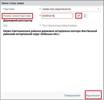 щоб відкликати заяву необхідно у вкладці «Виконати дію» заяви, що відкликається обрати операцію «Відкликати» (Рисунок 1), зазначити номер заяви-підстави (Заяви про відкликання заяви), перевірити внесений номер на наявність у ДРРП та, у разі успішної його перевірки, натиснувши кнопку «Відкликати» (Рисунок 2) – перевести заяву у стан «Відкликано».