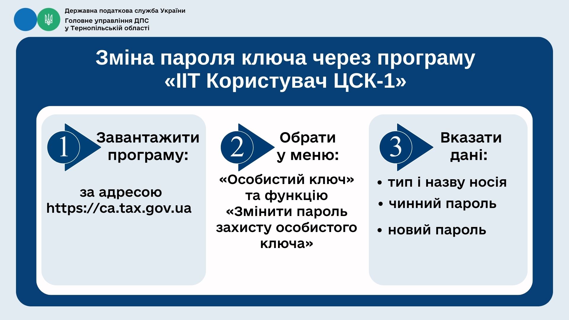 Головне управління ДПС у Тернопільській області повідомляє, що користувач, який отримав кваліфікований електронний підпис у Кваліфікованого надавача електронних довірчих послуг ДПС України, може змінити пароль захисту особистого ключа за допомогою програмного забезпечення «ІІТ Користувач ЦСК-1». Для цього необхідно встановити актуальну безкоштовну версію програми, яку можна завантажити на вебсайті Надавача за адресою ca.tax.gov.ua у розділі «Отримання кваліфікованих електронних довірчих послуг» → «Програмне забезпечення» → «ІІТ Користувач ЦСК-1» або безпосередньо за посиланням.