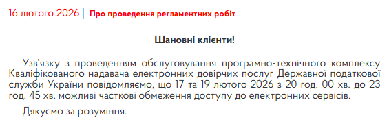 У зв’язку з проведенням обслуговування програмно-технічного комплексу Кваліфікованого надавача електронних довірчих послуг, ДПСУ повідомляє, що 17 та 19 лютого 2026 з 20 год. 00 хв. до 23 год. 45 хв. можливі часткові обмеження доступу до електронних сервісів.