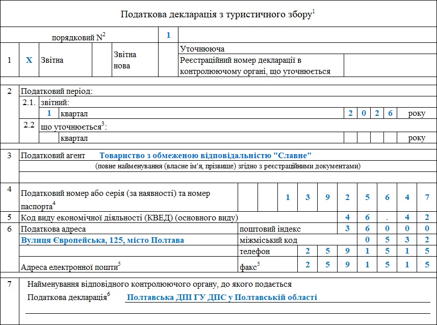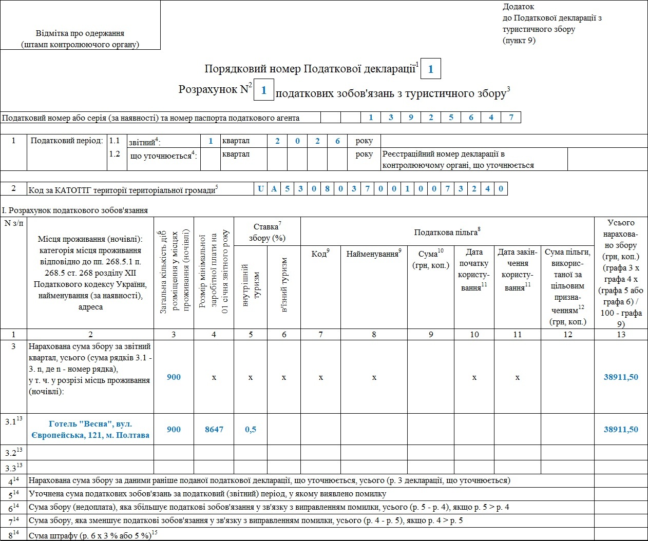 Зразок 1. Декларація з туристичного збору за І квартал 2026 року