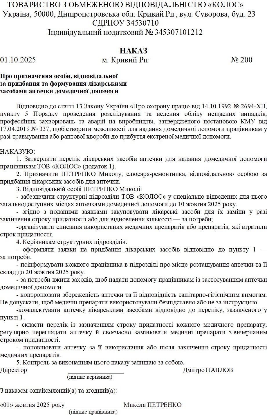 Зразок Наказу про призначення відповідальної особи за формування аптечки домедичної допомоги
