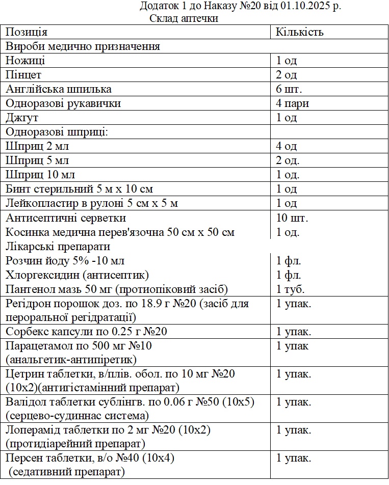 - Комплектація аптечки має відповідати умовам праці, і, якщо вона не визначена законодавством, може бути врегульована в колективному договорі або наказі керівника підприємства.