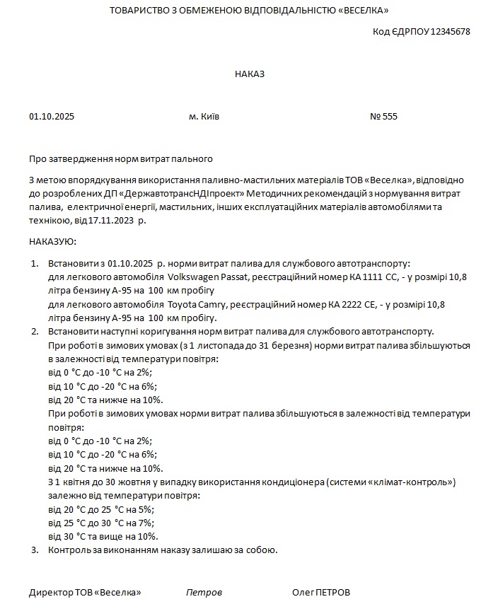 - Нормування витрат палива на роботу автомобілів. Юрособи і ФОПи повинні мати норми витрат палива для всіх своїх автомобілів. Для одного автомобіля може застосовуватись декілька норм залежно від умов його роботи. Юрособи затверджують норми наказом керівника, а ФОП може видати розпорядження за формою, аналогічною формі наказу.