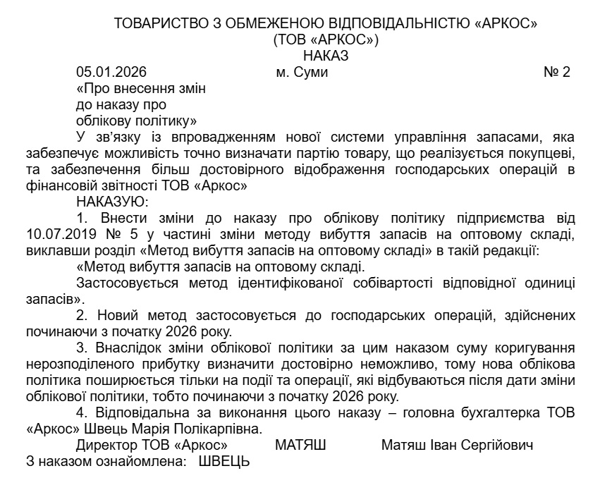 1) внести зміни до чинного наказу про облікову політику (див. зразок);