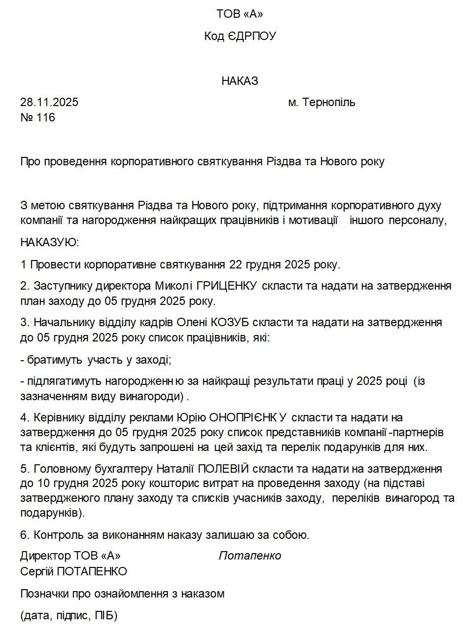 Але в такому випадку наказ треба складати не на новорічний корпоратив, а наприклад, на проведення річних зборів трудового колективу. І тоді в Плані заходу має бути більше про звіти щодо результати діяльності підприємства, співпрацю із партнерами, нагородження найкращих клієнтів та працівників і менше про розваги.