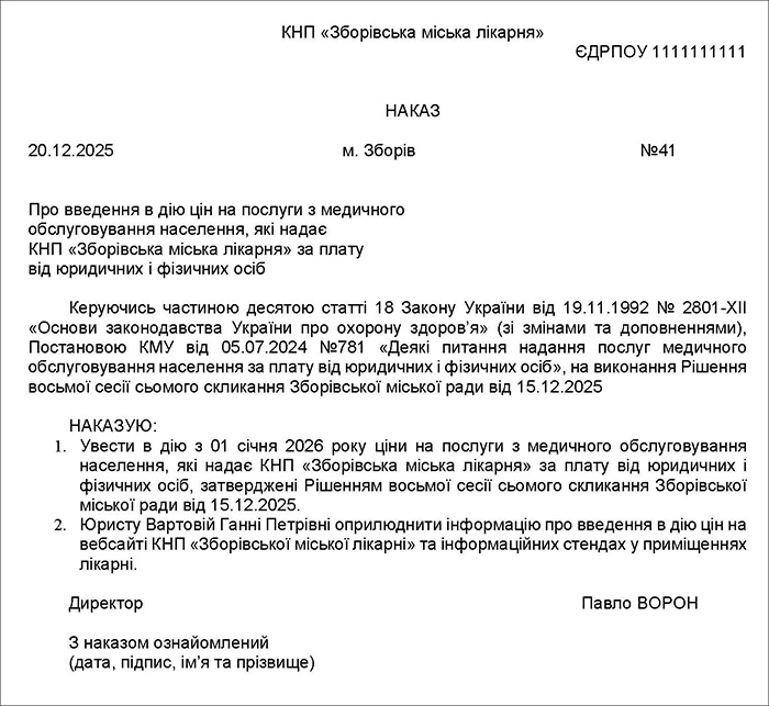 - КНП мають право самостійно встановлювати плату за медичні послуги, керуючись новим Переліком №781. Проте повноваження директора затверджувати ціни/тарифи наказом по підприємству мають бути прямо закріплені у статуті закладу, інакше це залишається виключною компетенцією місцевої ради.