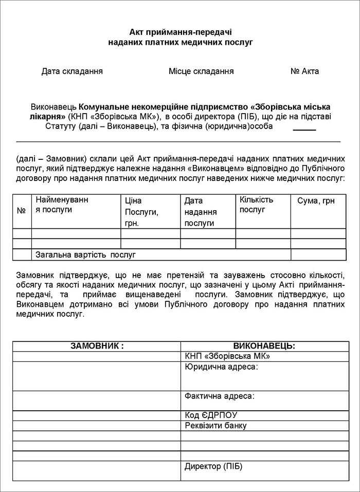 - Підставою для надання платних послуг є договір, який може укладатися як у паперовій формі, так і шляхом приєднання до публічної оферти, розміщеної на вебсайті КНП. Оплата здійснюється на умовах передоплати, а факт її внесення підтверджується банківською квитанцією або фіскальним чеком (залежно від способу розрахунку).