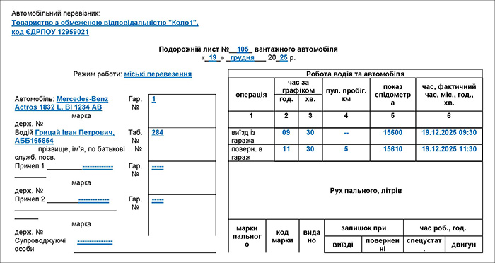 1. Фіксація роботи транспорту: У документі щоденно (або з іншою встановленою періодичністю) фіксуються показання спідометра на початок та кінець дня, загальний пробіг за день, час роботи та детальний маршрут (пункти відправлення/призначення, мета поїздки).