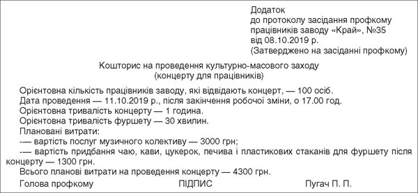 Як уже наголошувалося, фінансування профспілкою будь-якого заходу може розпочинатися з підготовки планового кошторису (див. зразок 1). Кошторис може затверджуватися на засіданні профкому.