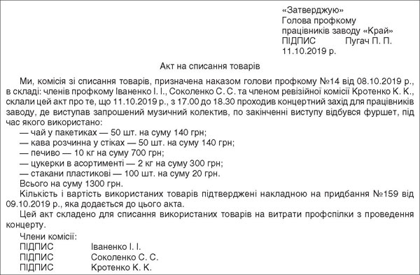 Після закінчення концерту використані під час фуршету чай, кава тощо списують за актом (див. зразок 2). Склад комісії для списання затверджується головою профкому. До складу комісії по списанню доречно долучати членів ревізійної комісії, за їх згоди.