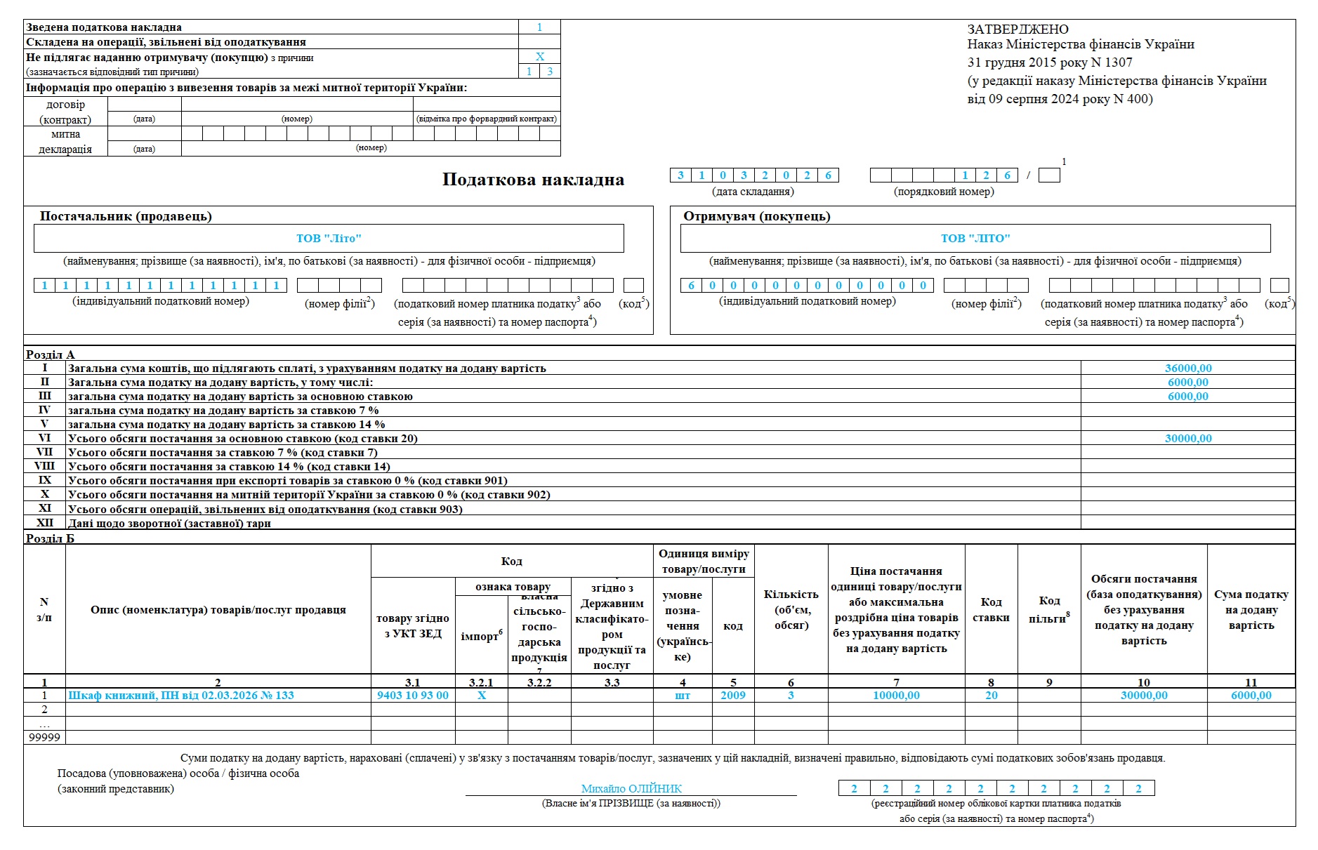 - у графі «Отримувач (покупець)» зазначається власне найменування (ПІБ);