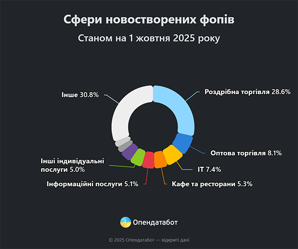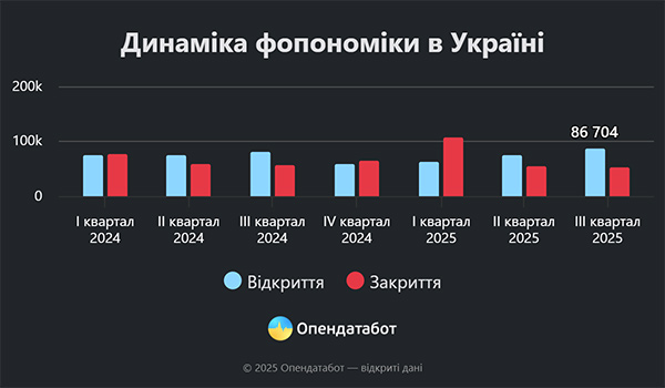 Опендатабот розповідає, що понад 225 тисяч нових ФОПів зареєстровано за 9 місяців 2025 року за даними Єдиного державного реєстру. Це майже стільки ж, як і за аналогічний період торік. Водночас понад 213 тисяч підприємців вирішили завершити свою діяльність цьогоріч. Це на 11% більше, ніж за той самий період 2024 року. Понад 1,6 тисячі ФОПів було відкрито іноземцями.