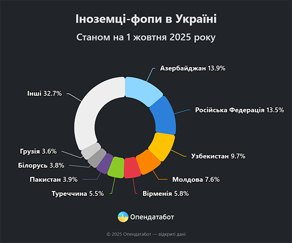 Активно йдуть у приватне підприємництво й іноземці: 1 648 нових ФОПів відкрили нерезиденти цьогоріч. Найбільше серед них – громадян Азербайджану, Росії, Узбекистану, Молдови та Вірменії.