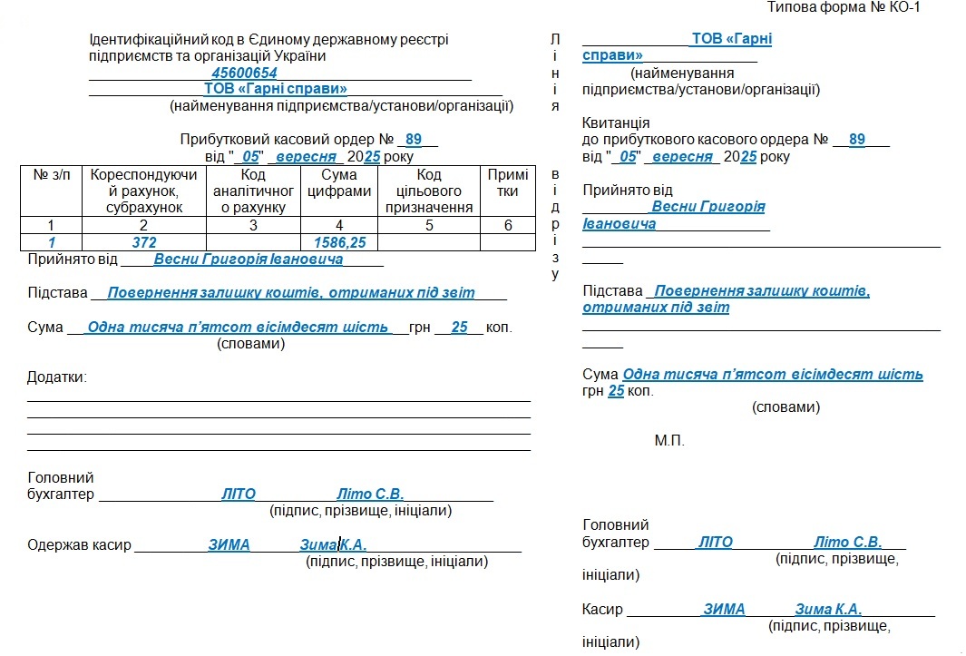 - «М. П.» (Місце печатки): Печатка ставиться лише на квитанції до прибуткового ордера, а не на його основній частині. Використання печатки не є обов'язковим.