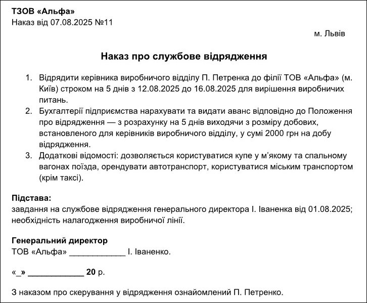 Для скерування працівника у відрядження видають наказ. У ньому доцільно зазначити ПIБ і посаду відрядженого працівника, пункт призначення, мету відрядження, назву підприємства, на яке відряджається працівник, строк відрядження, розмір добових, інші умови. Іноді до цього наказу додають кошторис витрат на відрядження.