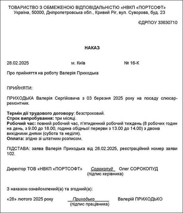 - Заголовок до тексту документа (наприклад, «Про прийняття на роботу», «Про звільнення…», «Про припинення трудового договору…»).