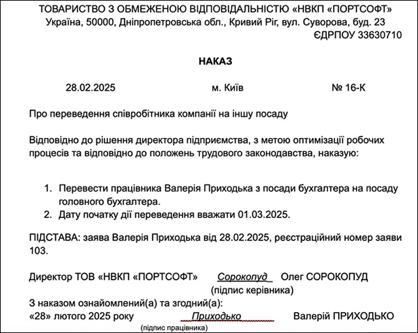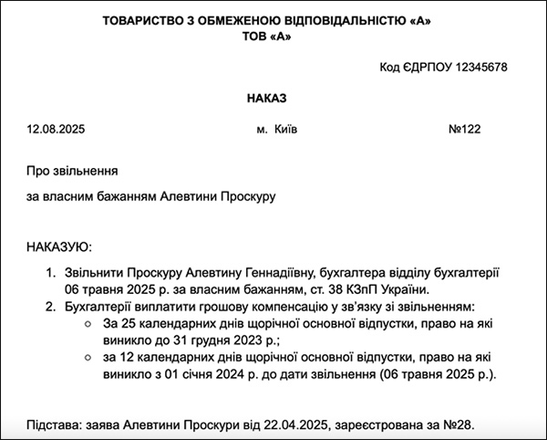 - Підстава для видання наказу (заява працівника; повідомлення про заплановане вивільнення тощо).