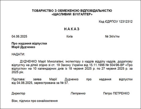 Зразок наказу про надання відпустки на дітей (Завантажити >>)