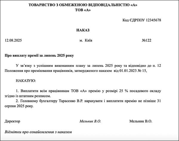 Наказ про премії — це внутрішній документ підприємства, який складається у довільній формі. Він має містити інформацію про те, хто, за що та в якому розмірі отримуватиме премію. Його зміст складається з: назви, дати та номера наказу, підстави для преміювання, ПІБ та посади працівників, розміру премії (у сумі або у відсотках) та підпису керівника.