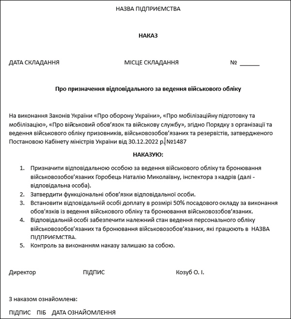 Зразок Наказу про призначення особи, відповідальної за військовий облік (Завантажити >>)