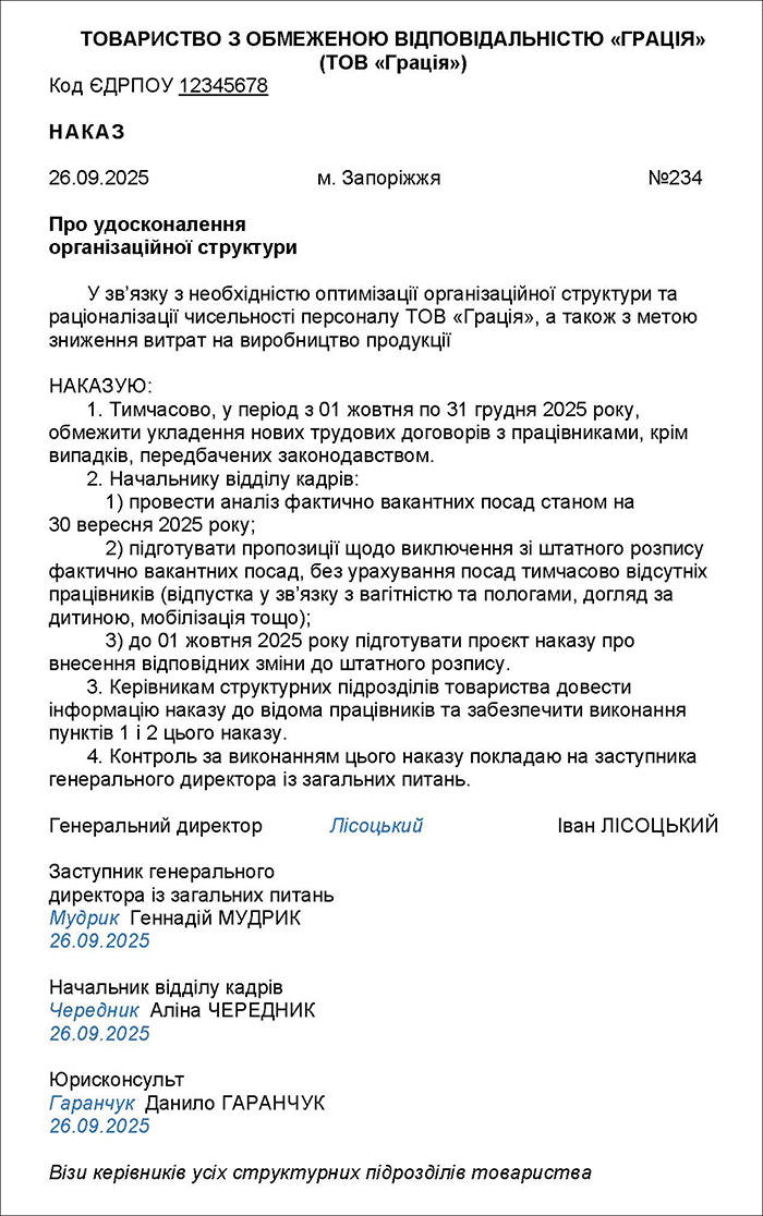 - призначення відповідальних осіб за напрями роботи, що не належать до основної діяльності юрособи (наприклад, за охорону праці, пожежну безпеку, ведення військового обліку працівників, організацію діловодства у структурних підрозділах тощо);