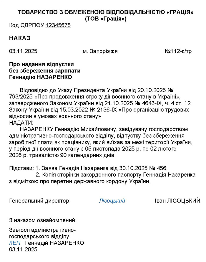 Наказ про надання відпустки без збереження зарплати (Завантажити >>)