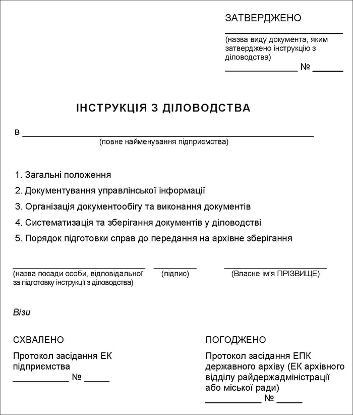 - проєкт інструкції підлягає схваленню ЕК підприємства та погодженню з ЕПК відповідної державної архівної установи або ЕК архівного відділу райдержадміністрації (міської ради), у зоні комплектування якої перебуває підприємства, з обов’язковим оформленням відповідних грифів схвалення і погодження, що їх розміщують на одному рівні у два стовпчики;