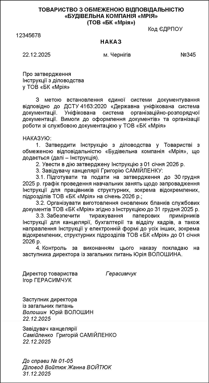 - Інструкція з діловодства набирає чинності з дати її затвердження, якщо іншу дату не зазначено у тексті наказу. Затверджену Інструкцію з діловодства доводять до відома структурних підрозділів підприємства шляхом направлення (розсилки) структурним підрозділам її примірників у паперовому або електронному вигляді;
