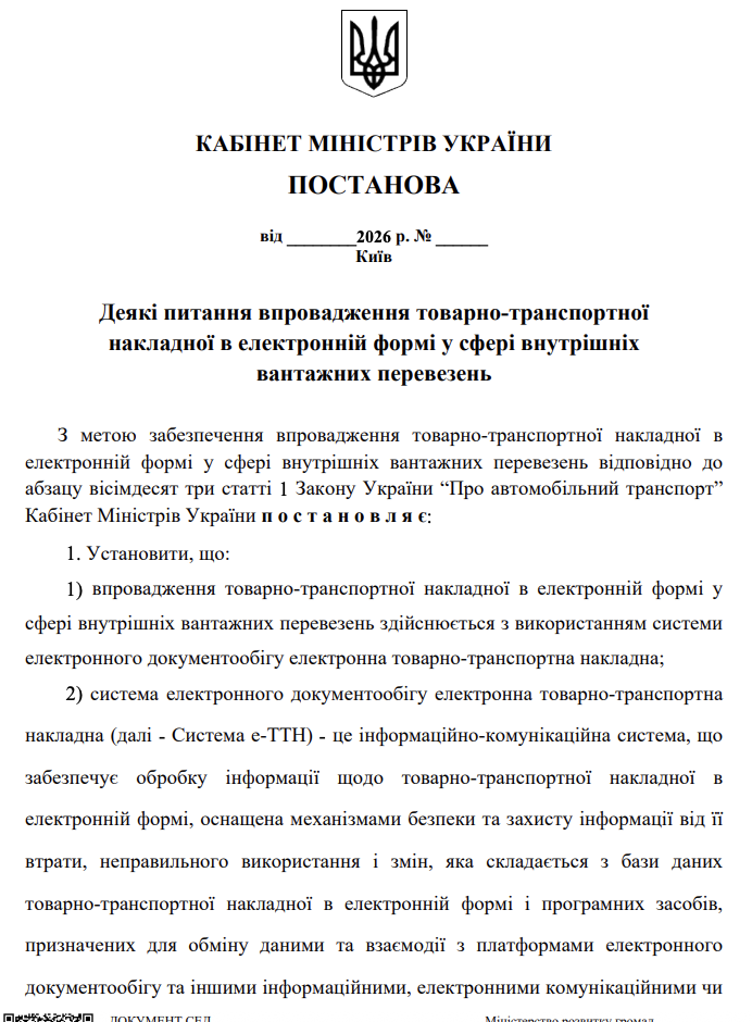 Нагадаємо, що ще у лютому 2026 року Міністерство розвитку громад та територій України повідомляло про підготовку законопроєкту, який передбачає закріплення електронної товарно-транспортної накладної (е-ТТН) як основної форми документа та обов’язкове її використання з 1 січня 2027 року.