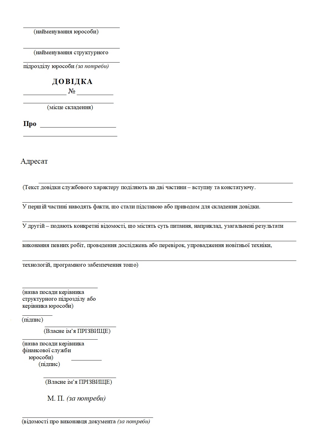 Уніфікована форма довідки службового характеру з кутовим розташуванням реквізитів
