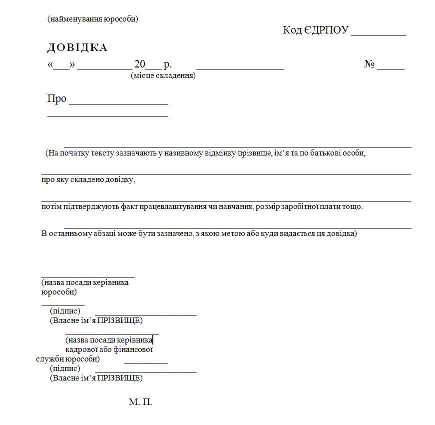 Довідка максимально може мати такий склад реквізитів згідно з ДСТУ 4163:2020 (напівжирним шрифтом виділено обов'язкові реквізити довідки):