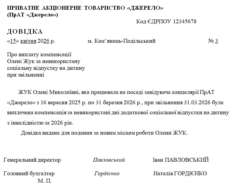 Довідка про виплату працівникові при звільненні компенсації за соціальну відпустку на дитину