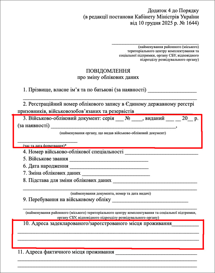 Постановою КМУ від 10.12.2025 №1644 також внесено зміни до Порядку організації та ведення військового обліку №1487. Зокрема, викладено в новій редакції Повідомлення про зміну облікових даних (додаток 4).