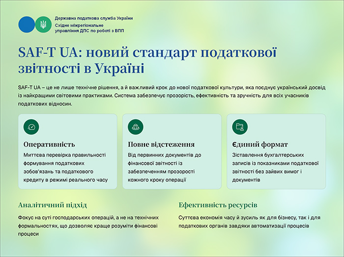 Східне міжрегіональне управління ДПС по роботі з великими платниками податків розповідає, що впровадження європейських стандартів у діяльність податкових органів потребує якісного та послідовного підходу. Так, для зручності платників на вебпорталі ДПС створено банер «SAF-T UA», в якому зібрано інформацію щодо стандартного аудиторського файлу.
