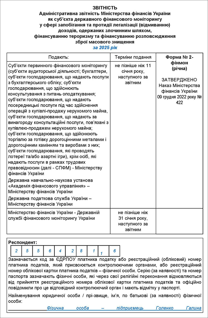 Зверніть увагу! Нещодавно Мінфін запропонував змінити строк подання цього Звіту на «не пізніше ніж 25 січня року, наступного за звітним». Але хоча ця пропозиція датована 16.12.2025 р., поки що офіційно жодних змін Наказ №422 не зазнав. Адже зміна дати подання вимагатиме і зміни до самої форми №2-фінмон (річна), де ця дата вказана безпосередньо у його тексті.