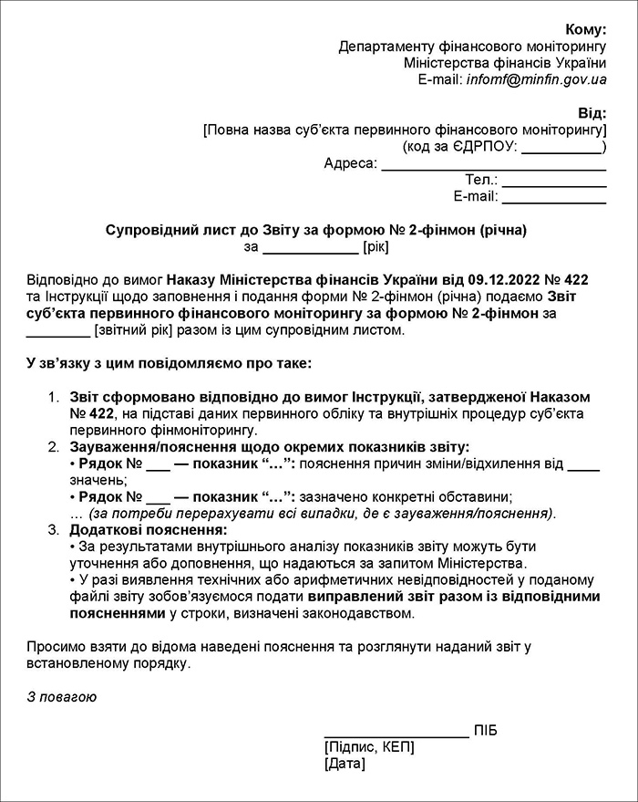 - супровідний лист подається лише за наявності зауважень та/або застережень до показників звіту за формою №2-фінмон (річна).