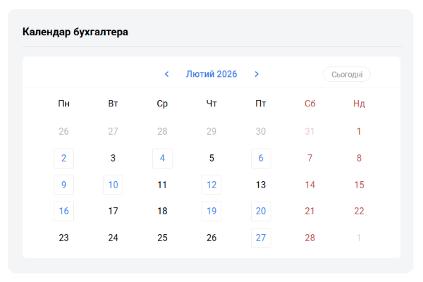 | 20 лютого | Сплата | ДПС | Авансовий внесок з єдиного податку платниками єдиного податку 1-ї та 2-ї груп | за лютий 2026 р. | - |