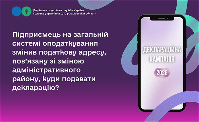 ДПС у Харківській області звертає увагу суб’єктів господарювання, що у разі зміни податкової адреси, пов’язаної зі зміною адміністративного району, фізична особа – підприємець на загальній системі оподаткування подає податкову декларацію про майновий стан і доходи з додатками до контролюючого органу за новим місцезнаходженням, а сплачує податок на доходи фізичних осіб та військовий збір до відповідних бюджетів за попереднім місцезнаходженням до закінчення поточного бюджетного року.