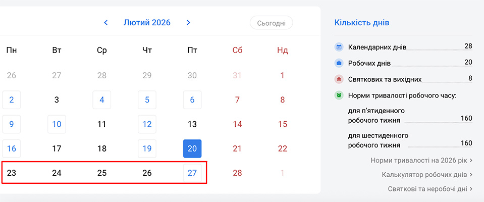 Ознайомлюйтеся з календарем бухгалтера на період з 23 по 27 лютого 2026 року та плануйте робочий графік без ризику порушень.
