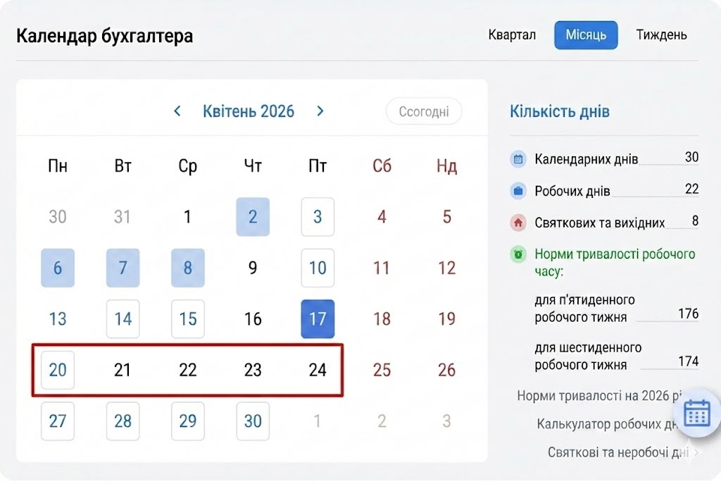 Ознайомлюйтеся з календарем бухгалтера на період з 20 по 24 квітня 2026 року та плануйте робочий графік без ризику порушень.