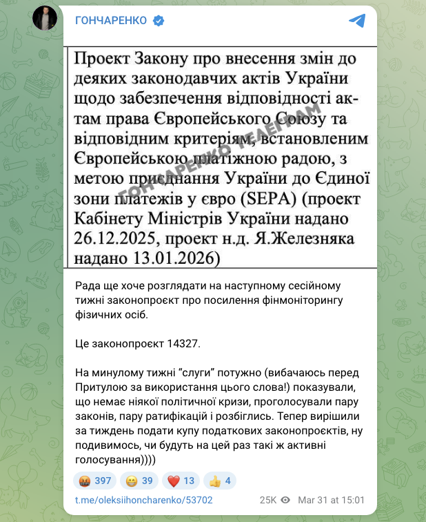 31 березня О. Гончаренко повідомив, що законопроєкт №14327-1 про посилення фінмоніторингу фізичних осіб розглянуть на наступному сесійному тижні.