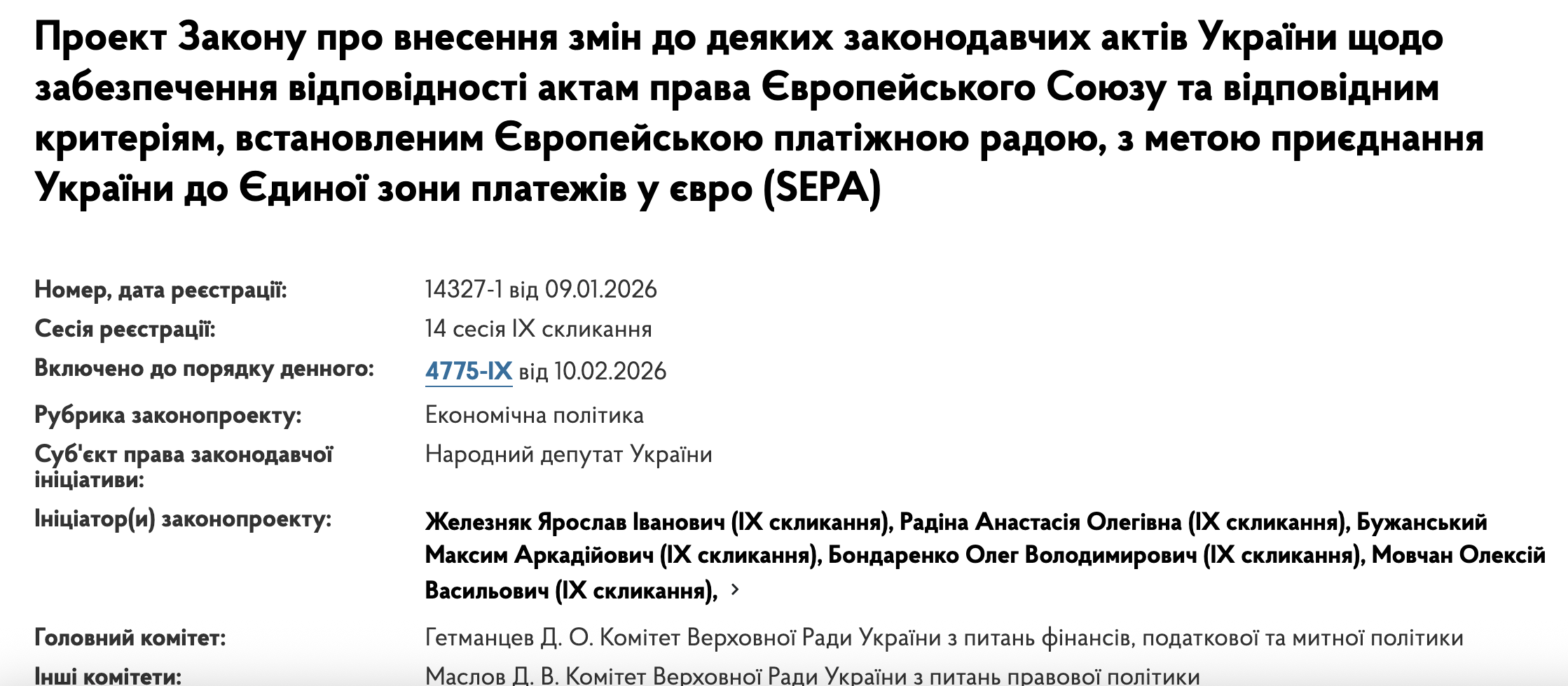Нагадаємо, що ще 9 січня 2026 у ВРУ зареєстровано законопроєкт №14327-1 "Про внесення змін до деяких законодавчих актів України щодо забезпечення відповідності актам права Європейського Союзу та відповідним критеріям, встановленим Європейською платіжною радою, з метою приєднання України до Єдиної зони платежів у євро (SEPA)". Автори - Я. Железняк та ін. нардепи. Цей проєкт є альтернативним до урядового законопроєкту №14327, про який ми писали тут.