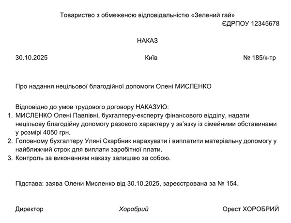 - складений наказ керівника підприємства на підставі даних із таких заяв про надання благодійної допомоги,