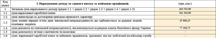 Загальна сума нарахованого доходу (рядок 1) – 264 535,00 грн, з них: