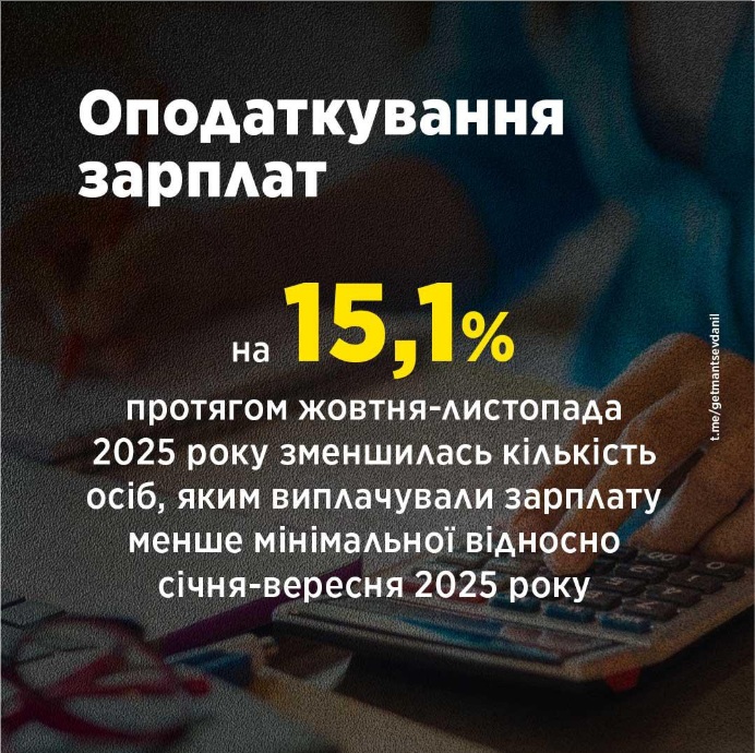 - на 15,1% протягом жовтня - листопада 2025 року зменшилась кількість осіб, яким виплачували зарплату менше мінімальної відносно січня - вересня 2025 року.