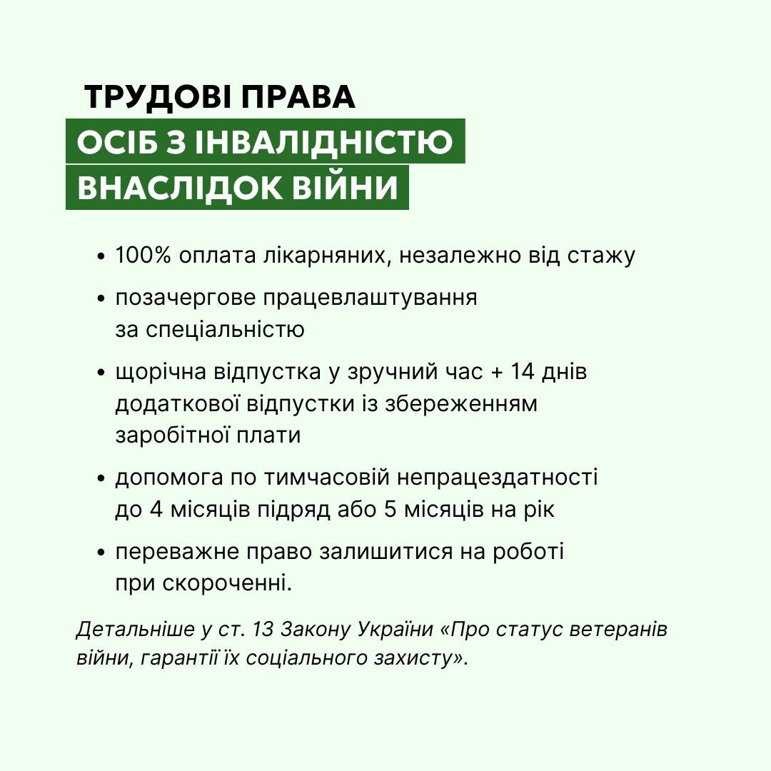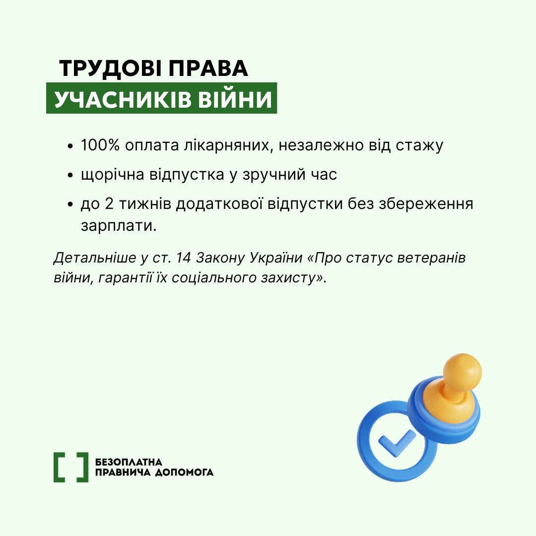 Ветерани війни мають низку трудових прав, передбачених законом. Учасники війни мають право на виплату лікарняних у розмірі 100% незалежно від стажу і можуть брати відпустки в будь-який момент. Докладніше про те, на кого саме вони поширюються, читайте у новині